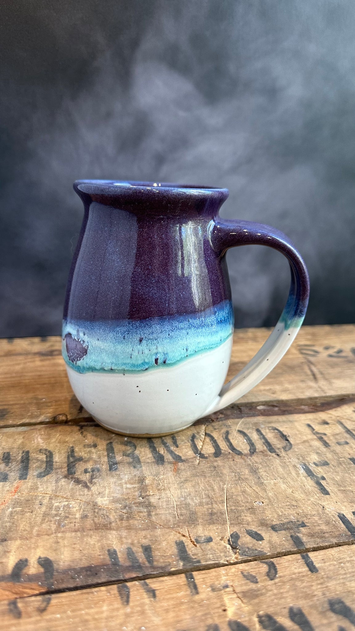 This listing is for a white, turquoise, and purple mug featuring a 22k white gold crescent moon. The mugs hold about 16oz of liquid.