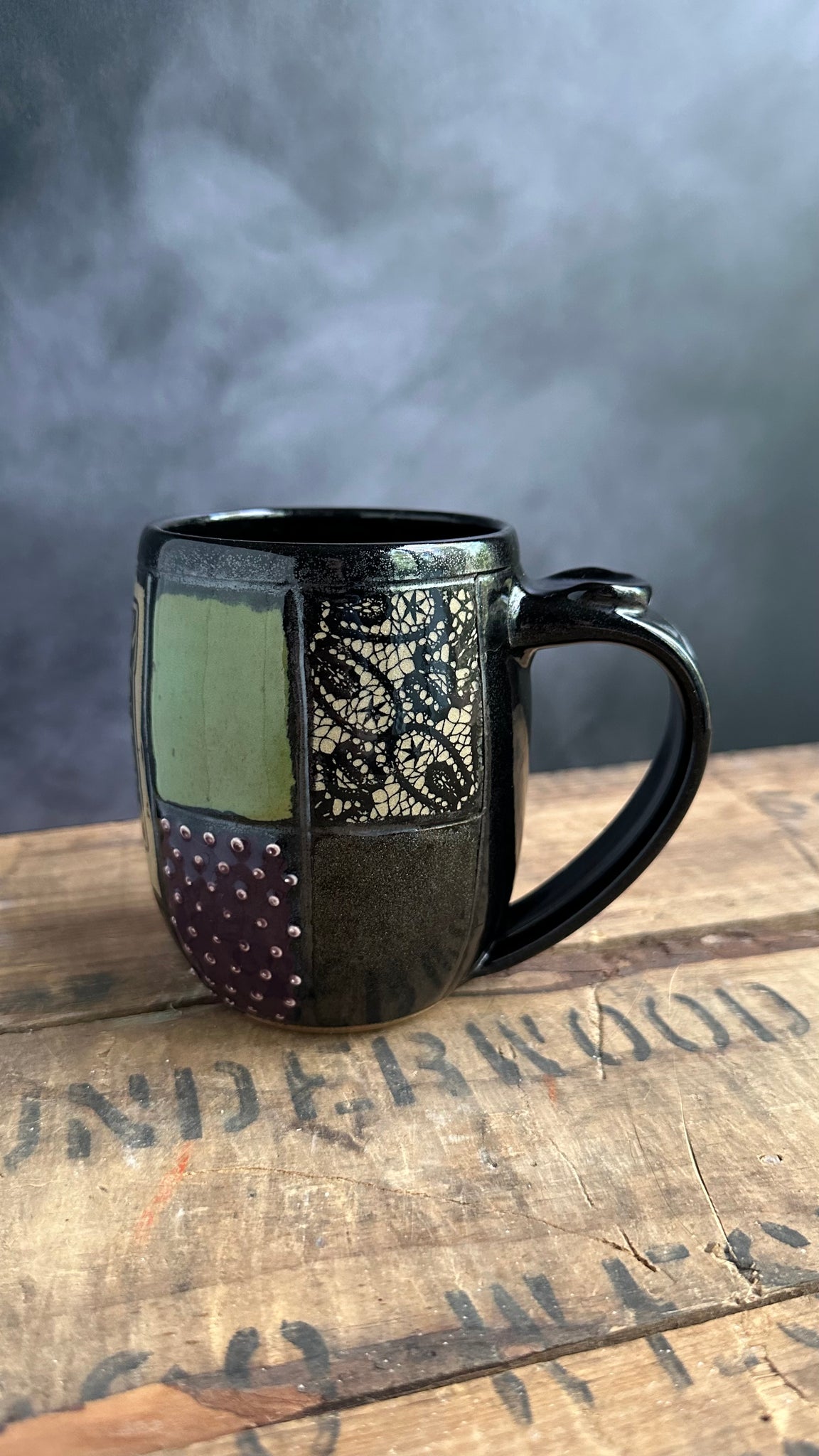 *This mug is slightly discounted due to some thin spots on the slip trailed dots, and some bits that had to be sanded for safety. They are all smooth, but just don’t have glaze as thickly on them.