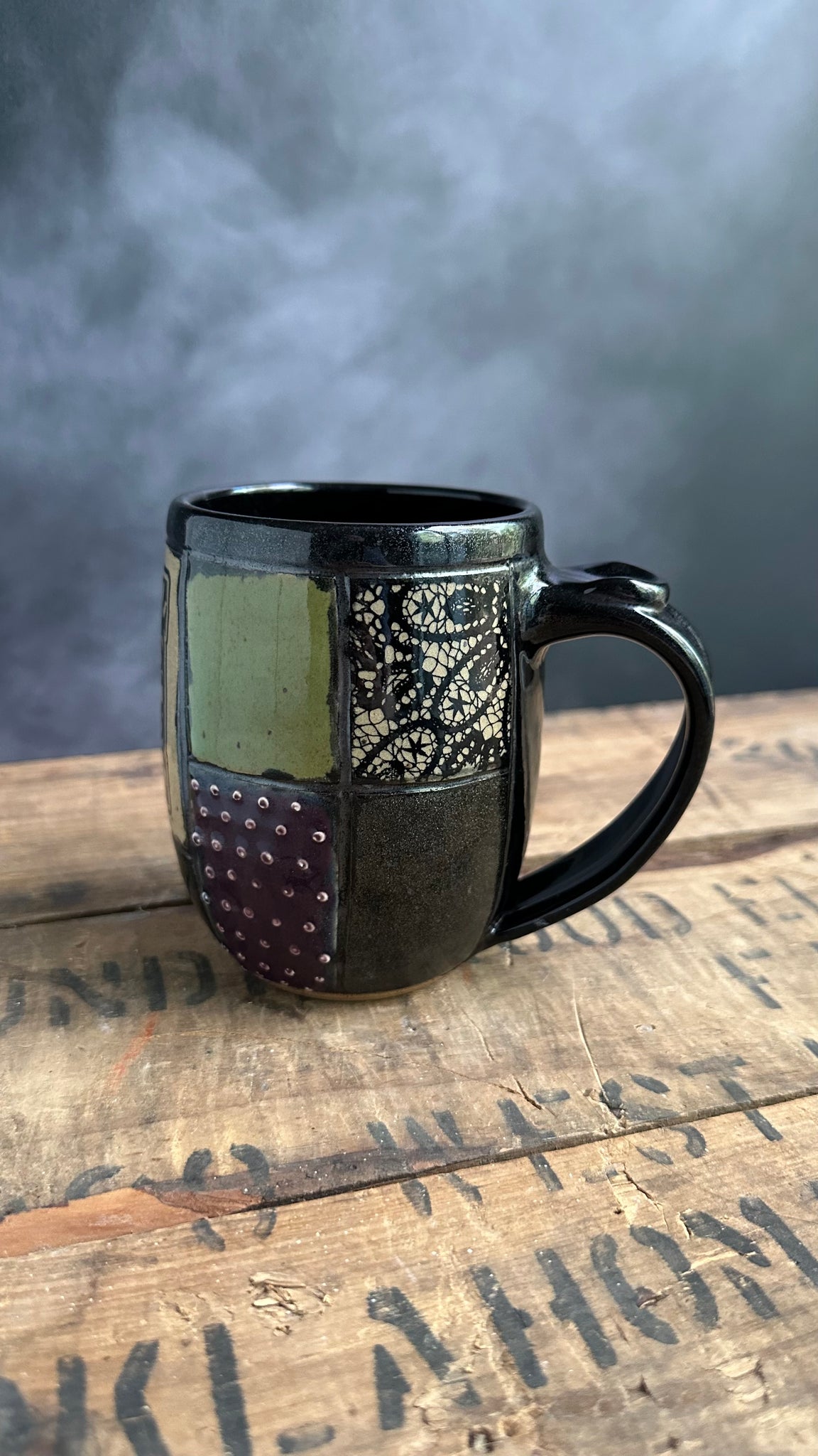 *This mug is slightly discounted due to some thin spots on the slip trailed dots, and some bits that had to be sanded for safety. They are all smooth, but just don’t have glaze as thickly on them.