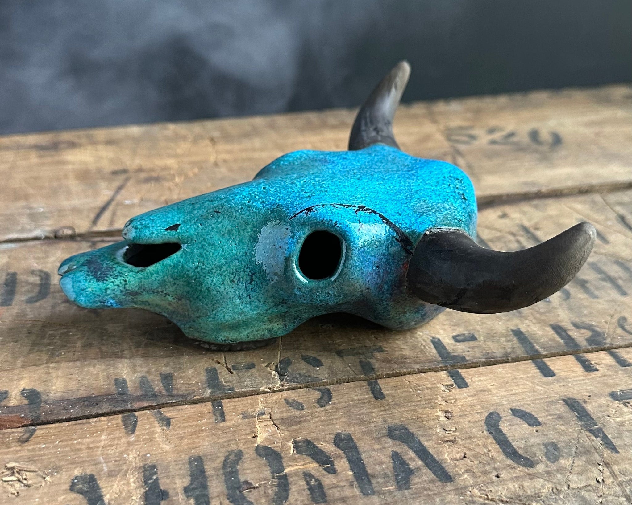 This slip cast cow skull is raku fired. it measures about 5.5" wide.