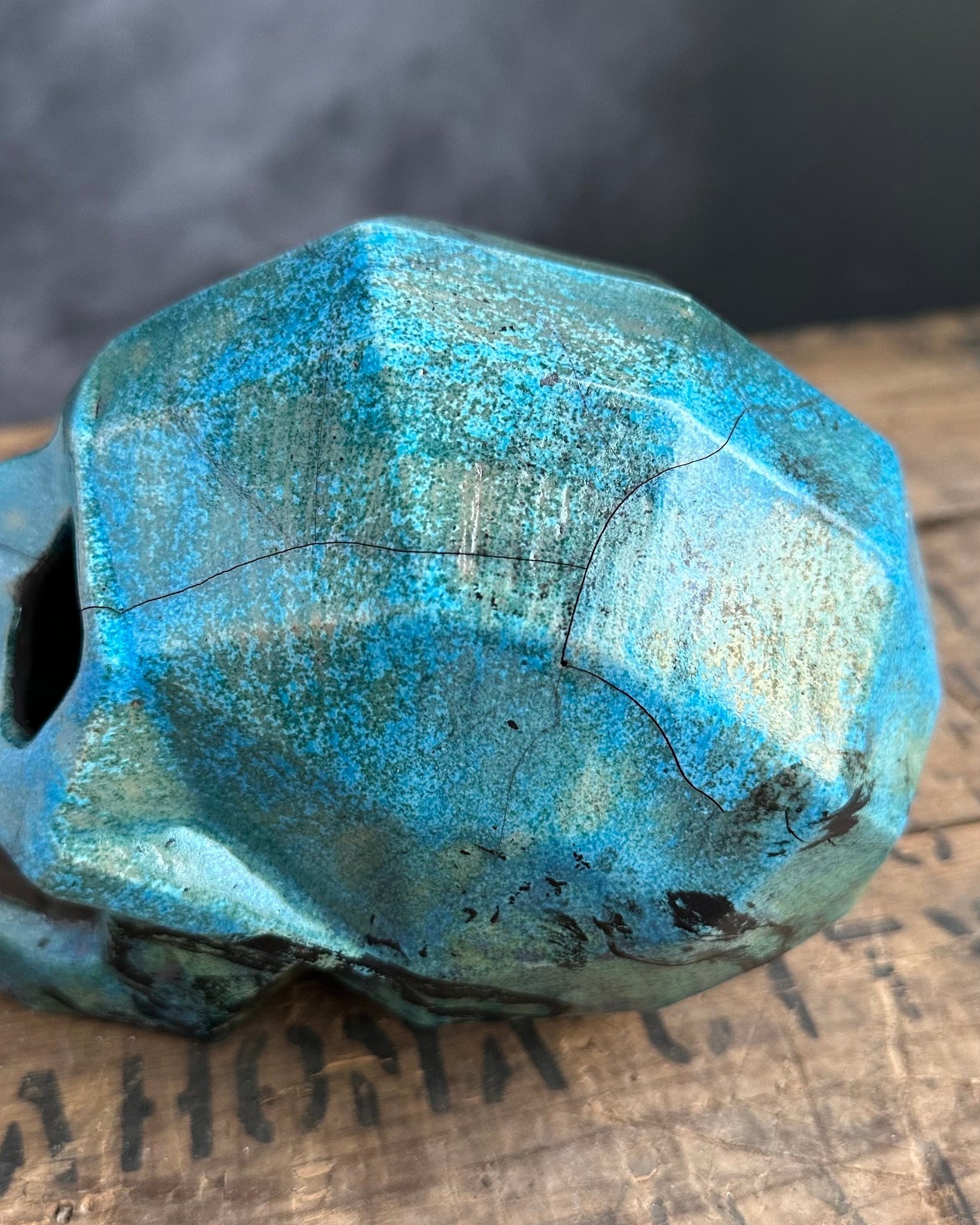 This skull is slightly discounted due to a crack in the clay that happened in the raku firing process. Exercise caution with this flaw. I have discounted the piece as a result of this flaw.