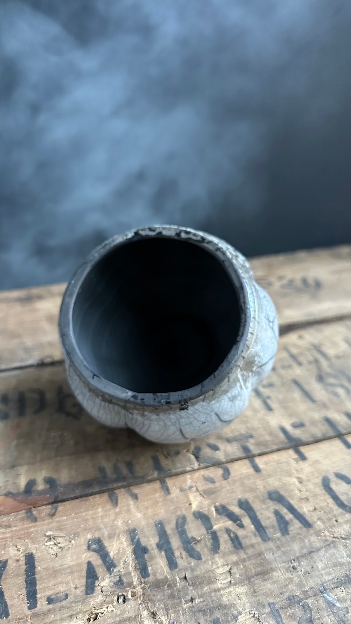 This wheel thrown pumpkin is raku fired, standing about 4.5” tall. It was thrown without a bottom to speed the drying process, so you will see a hollow bottom on the piece.