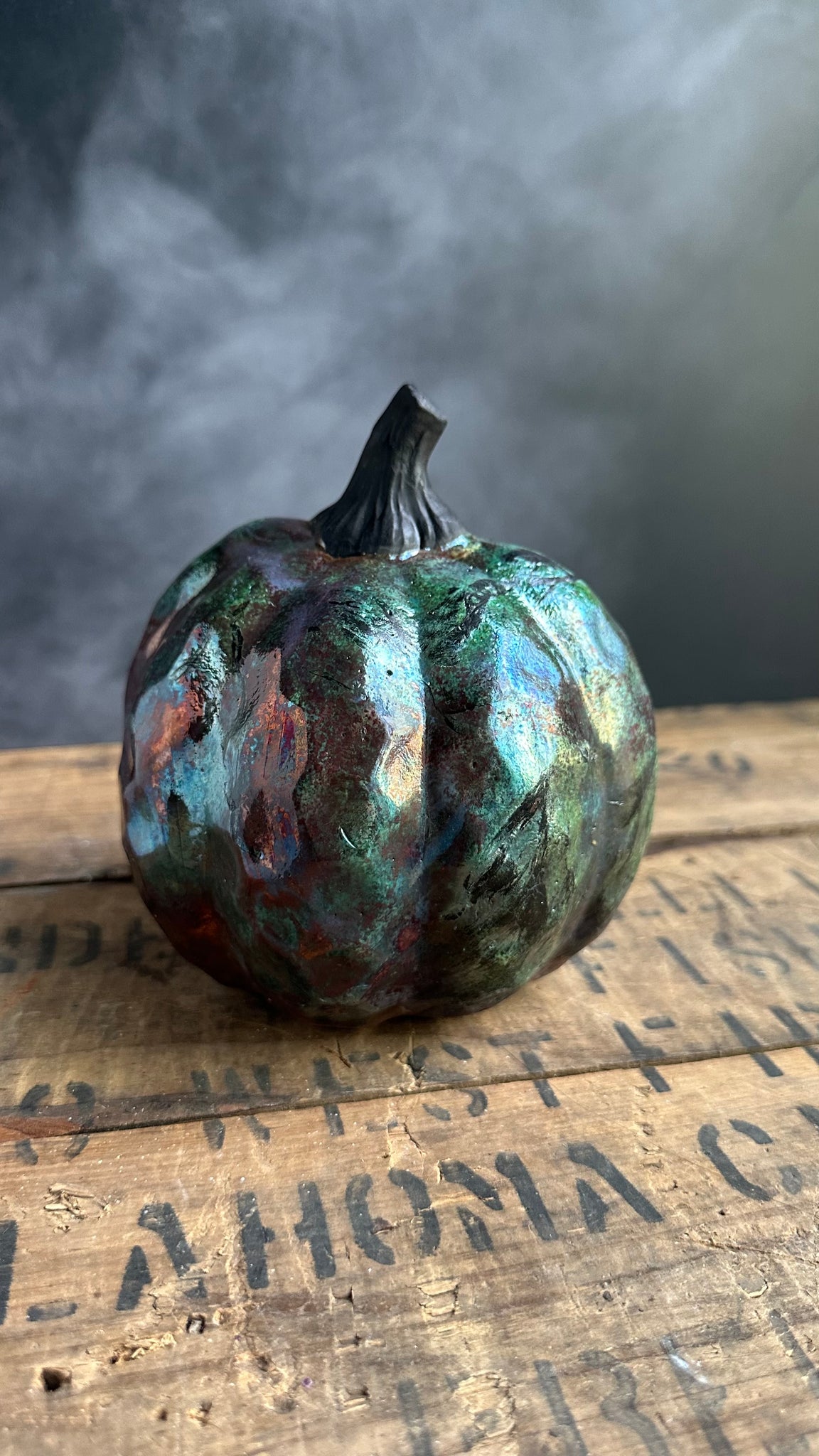 This slip cast pumpkin is raku fired, standing about 4.5” tall. It was thrown without a bottom to speed the drying process, so you will see a hollow bottom on the piece.