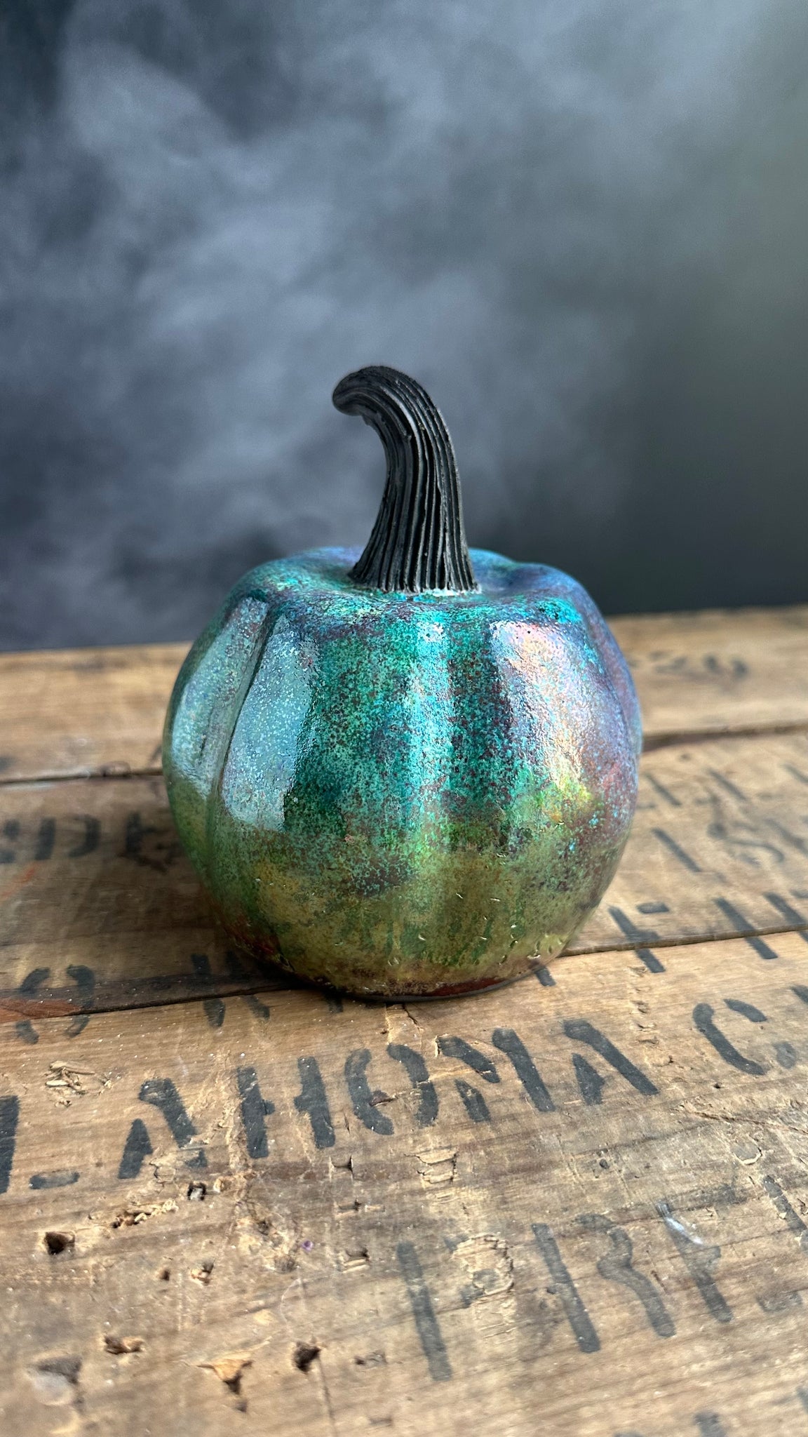 This wheel thrown pumpkin is raku fired, standing about 4.5” tall. It was thrown without a bottom to speed the drying process, so you will see a hollow bottom on the piece.