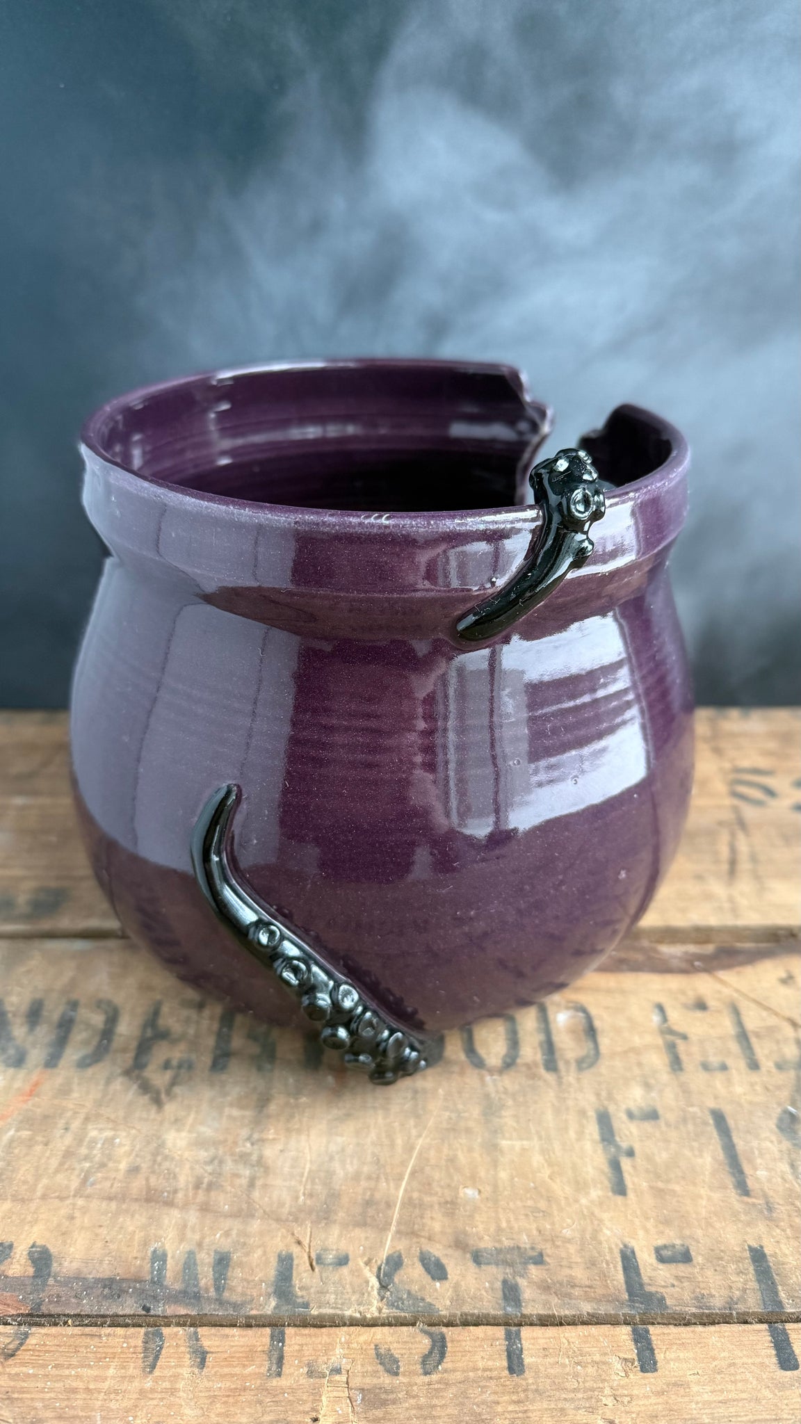 This listing is for a wheel thrown and hand carved ceramic yarn bowl. It features a 22k gold clay nautilus, clay seaweed, coral, and tentacles. The body is glazed in an eggplant purple glaze. It measures about 6” at the opening, and 6” tall.
