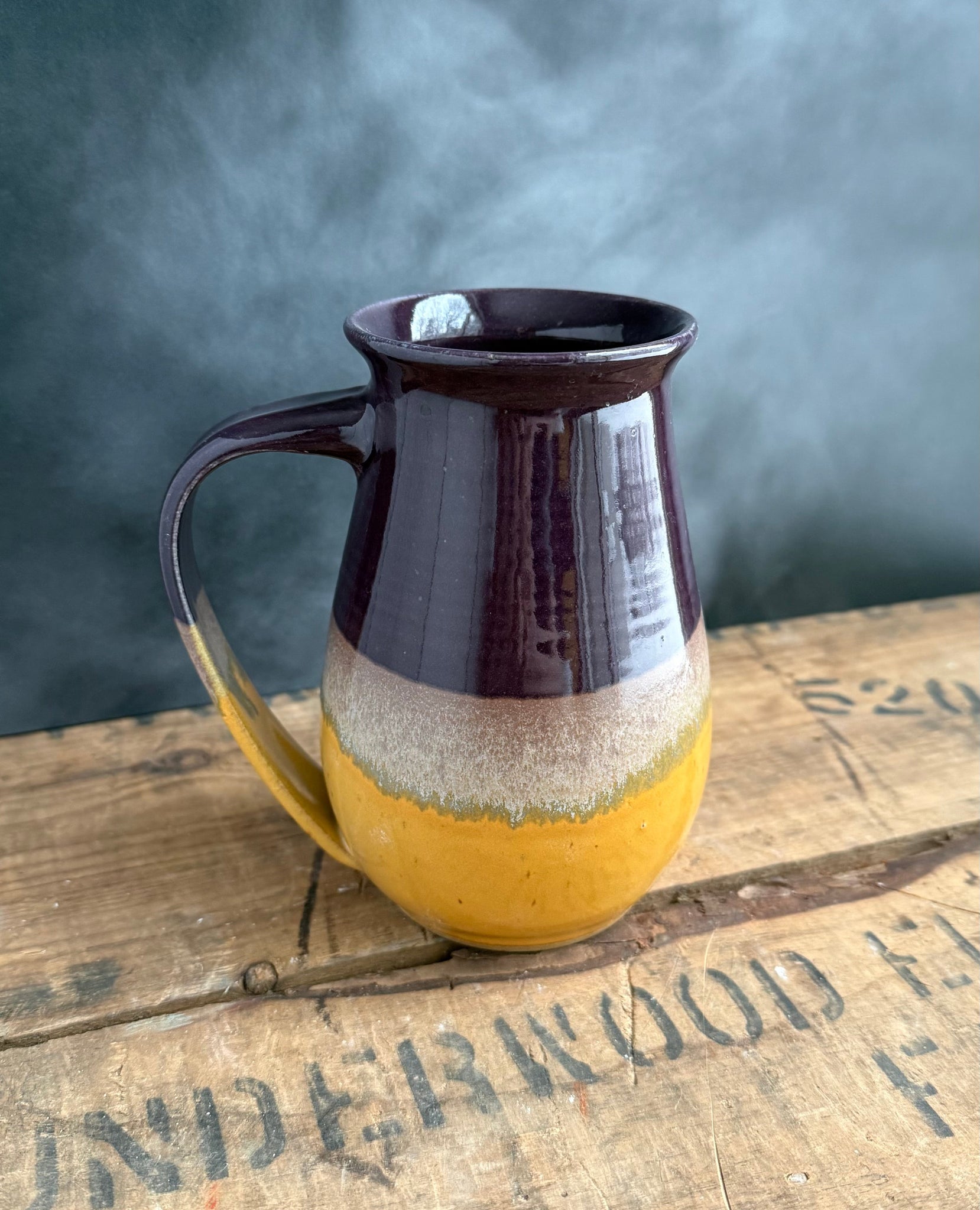 This listing is for a wheel thrown ceramic mug featuring an eggplant purple glaze, and a yellow glaze. It is microwave and dishwasher safe. It holds about 16oz of liquid.